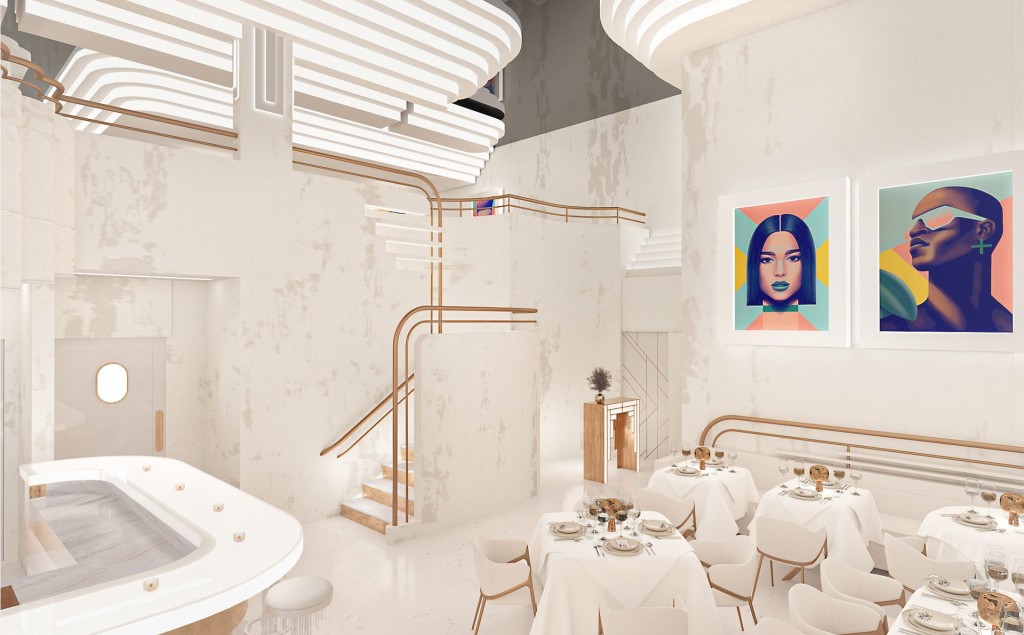 Art Deco established itself as one of the most glamorous and elegant styles of the 20s and 30s, and this status continues to this day, still embodying elegance and sophistication. Our desire is to create an avant-garde venue that awakens the senses of all fine gourmets, in an atmosphere that is both light and well-groomed. We aim to capture the essence of Art Deco through its shapes and volumes, reinterpreting it in a contemporary way. Particular attention was paid to the ceiling, whose volumetry was designed to absorb sound. We added luminous strips and used Inove’s stretched PVC films to provide a superior finish.