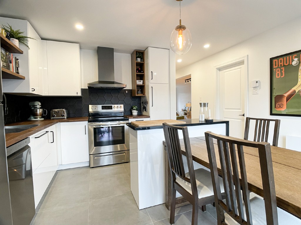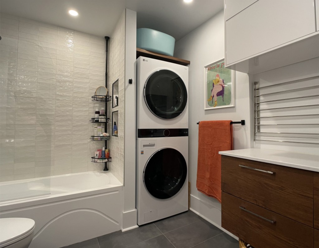 Ce client nous a contactés après la démolition de sa cuisine et de sa salle de bain. Initialement, il envisageait de conserver les armoires de cuisine pour des raisons budgétaires. Cependant, il a rapidement compris que cette option n’était pas viable, et a donc décidé de tout changer. Le défi résidait dans la création d’une cuisine fonctionnelle avec un îlot et quatre places assises pour recevoir des amis. En ce qui concerne la salle de bain, il était essentiel d’aménager un espace pour le lavage et le séchage des vêtements, tout en préservant l’intégrité de la zone de salle de bain.