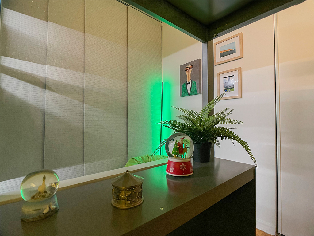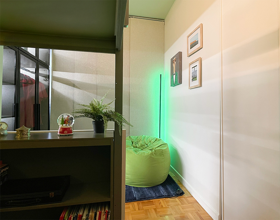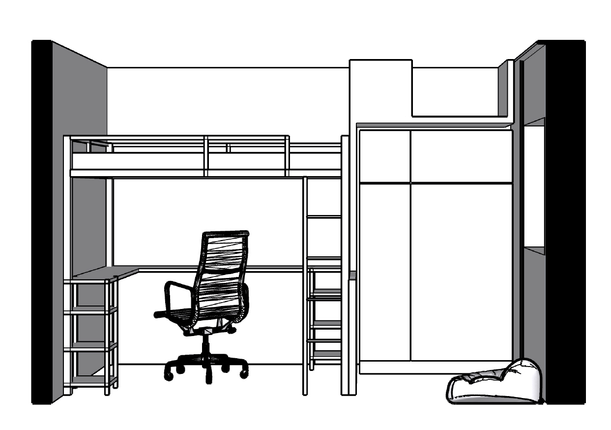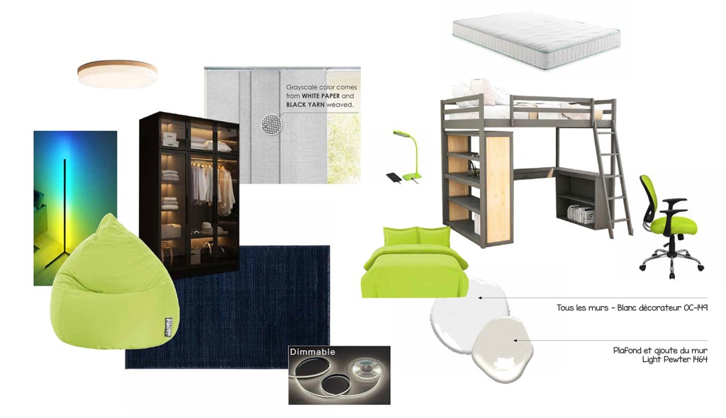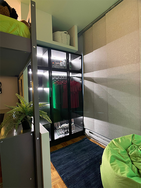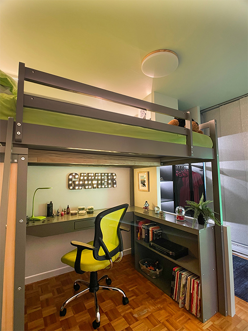 Ce projet nous tient profondément à cœur. Nous avons contribué à réaliser le rêve d’un enfant atteint d’une maladie grave, une enfant de 11 ans dont nous préserverons l’identité. Il souhaitait une nouvelle chambre, un rêve durable qu’il pourrait apprécier le plus longtemps possible. Après la rencontre avec lui et sa famille, il nous a transmis ses idées. Le défi était de taille car la chambre ne faisait que 115 pieds carrés. Il désirait un grand lit mezzanine avec un espace de travail en dessous, un coin d’exposition pour ses Lego (Il est un grand inventeur et constructeur), plusieurs types d’éclairage pour la lecture et une ambiance, des LED de couleur, un espace lecture, tout en conservant le garde-robe existant pour ses vêtements